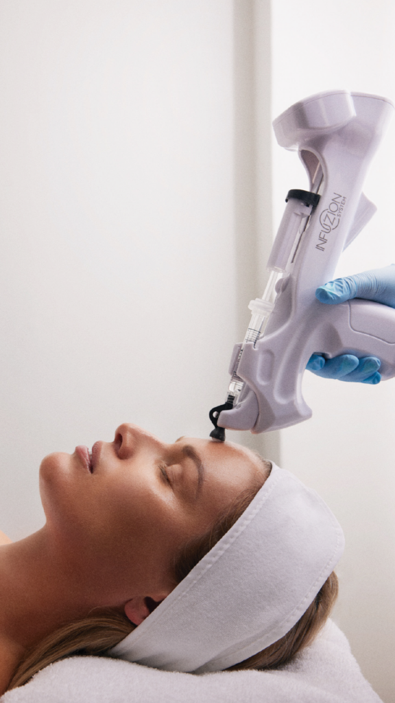 Système Infuzion® + sérum Volymizer à l’acide hyaluronique : technologie sans aiguilles permettant une pénétration optimale. L’acide hyaluronique infusé après le PRP apporte l’hydratation nécessaire aux peaux matures pour potentialiser les effets du soin.